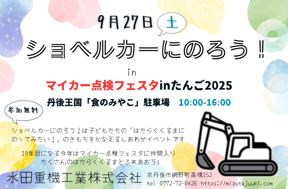 今年は丹後地区自動車整備協議会様が主催の「マイカー点検フェスタinたんご2025」に仲間入り。ショベルカーや建設機械だけでなく、いろいろな種類のくるまと出会えますよ。さらにマイカーを無料点検してもらえたり、歌やダンスのステージがあったりと盛りだくさんです。ぜひお越しくださいね。場所は道の駅 丹後王国「食のみやこ」駐車場 です。